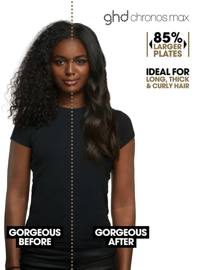 Do you have long, thick or curly hair? Are you looking for sleek, shiny & smooth results that last all day? Introducing NEW ghd Chronos Max – Wide Plate Hair Straightener for 3X faster₁ styling, in just one stroke₄.ghd’s cutting-edge HD motion-responsiveTM technology is now available in wide plate styling to transform long, thick and curly hair in one stroke for results that last 24hrs₂.
