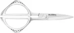 Global Knives are proud to produce a matching set of kitchen shears to compliment your range of Global kitchen knives. These scissors feature heavy weight cast steel handles and feel very substantial whilst held. The steel blades are thick and strong and contain small teeth to help grip chicken fillets and other meats. Between the handles you will also fit a nut cracker. These sicssors will also fit into the butcher’s steel slot on most ship shape type Global blocks.