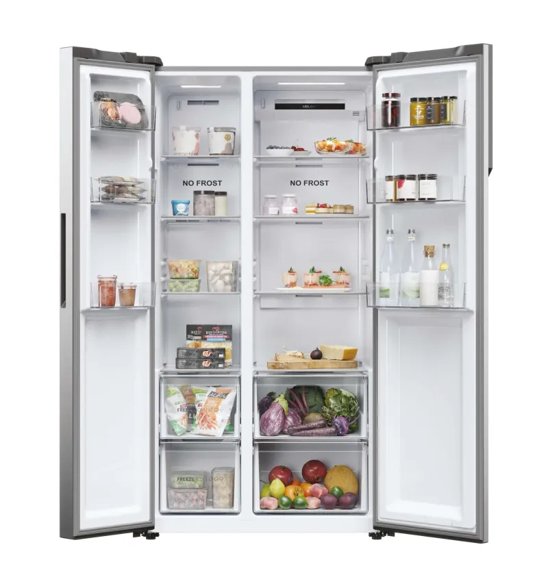 The Haier HSR5918DNMP American-style fridge freezer offers a spacious 591-litre capacity, No Frost technology, and a sleek stainless steel design. Enjoy fresh food and organized storage with its innovative features, including a My Zone compartment with adjustable temperature settings and a convenient non-plumbed water dispenser.