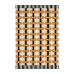 - This stylish rug has a unique design featuring repeat geometric motifs in striking yellow-orange, black and white, perfect for adding a touch of colour to any space.