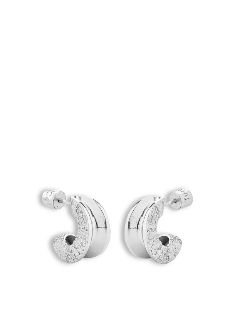 Concave huggie hoop earrings with textured edging, handcrafted From recycled materials and finished with an anti-tarnish, water resistant coating.