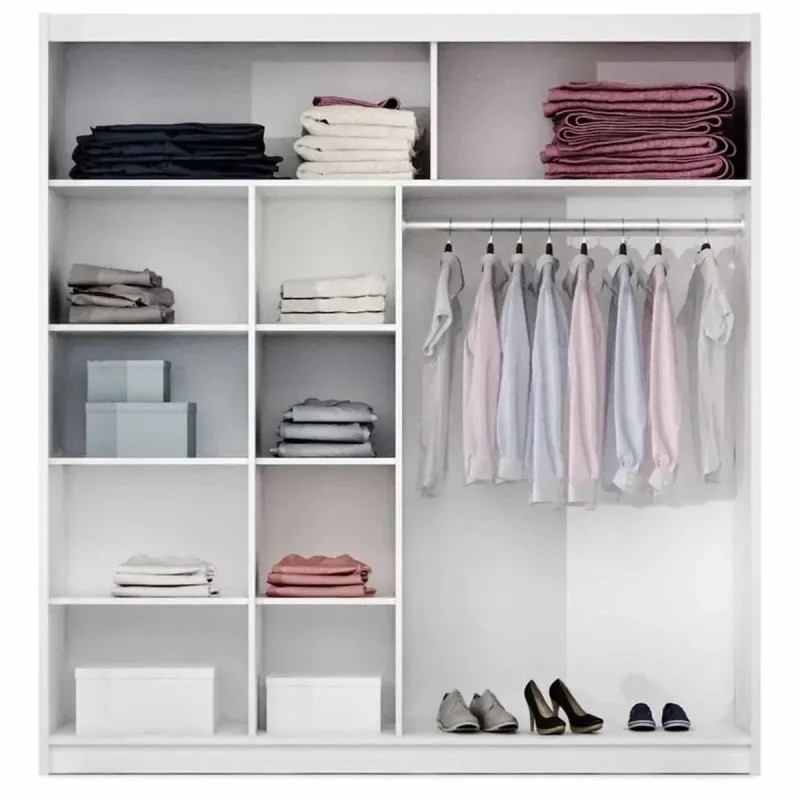 Elevate your bedroom with the Highland Sliding Door Mirrored 203cm Wardrobe in white and black. This stunning wardrobe features a full length mirrored door and a sleek white glass door, making it a powerful and eye-catching addition to any space. With 8 spacious shelves and ample hanging room, this wardrobe provides the equivalent of 4 standard wardrobes in one. You can customize the storage by adding additional small hanging rails and choosing the placement of the shelves. Despite its abundance of glass, the doors slide smoothly and silently thanks to the high quality 16mm laminated chipboard used in its construction. Transform your room with style and quality by choosing the Highland Sliding Door Mirrored Wardrobe.