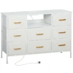 Discover the convenience of modern living with the HOMCOM Fabric Chest of Drawers. This chic bedroom chest of drawers includes built-in power outlets, a USB port, and a USB-C port, making charging devices hassle-free. Wrapped in plush boucle fabric with stylish gold-tone handles, it’s the perfect storage unit with drawers for any room, adding a touch of elegance and functionality to your space.