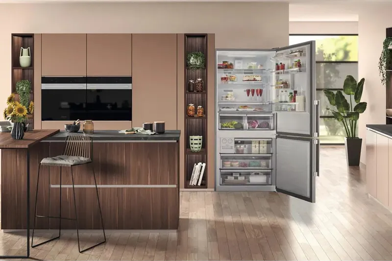 Featuring thoughtful technology that keeps your food fresh, this large Hotpoint freestanding Dual No Frost Fridge Freezer in stainless steel has all the space you need for your shopping. Dual No Frost technology is Hotpoint best solution to keep your fridge and freezer frost-free. Two independent evaporators circulate air around both the fridge and freezer so ice and moisture can’t build up, meaning you won’t be left with soggy salads or the chore of defrosting your appliance ever again. Food temperature is kept stable thanks to MultiCool Flow, which evenly distributes cool air inside the fridge and freezer to give a constant and uniform flow of air. Inside the fridge, the Fresh Zone 0°C drawer creates the right environment to care for your meat and fish, while the Fresh Zone+ drawer keeps your fruit and vegetables fresh for up to 2 weeks* thanks to the handy humidity control. The Fast Freeze function also allows you to quickly freeze your groceries, rapidly dropping the temperature of the freezer to help maintain the freshness of your food. It’s quiet too. At just 41dB(A) this fridge freezer goes unnoticed, working quietly in the background. *Based on weight loss and visual quality, considering common fruits and vegetables. Internal test procedure.