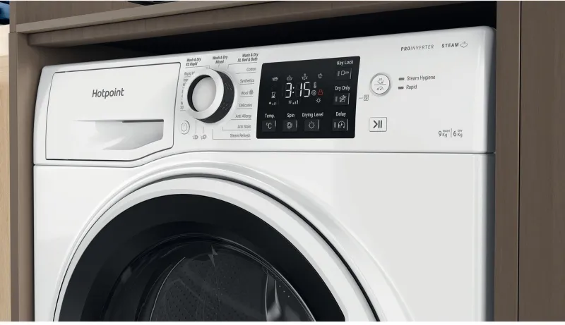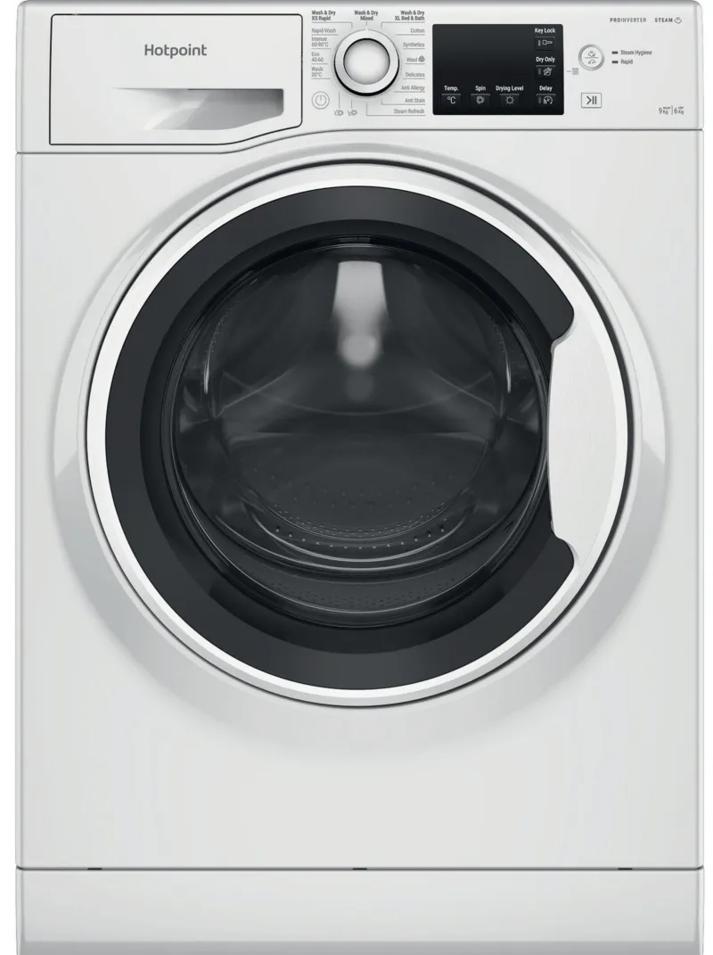 Upgrade your laundry experience with the Hotpoint NDBE9635WUK 9Kg / 6Kg Washer Dryer, where high performance meets energy efficiency, ensuring your clothes are cared for effortlessly.