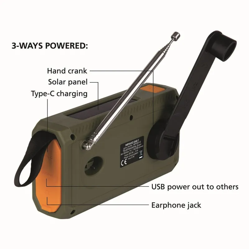 Impavio DAB1 Robust DAB+/FM | Hand Crank | Portable Outdoor Radio