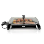 - HEATS UP QUICKLY TO A STABLE TEMPERATURE, GLASS LID – The Temperature Control Panel allows you stabilizing the grilling temperature: 90°C to 220°C, Glass lid for heat quicker and protection for splashing!