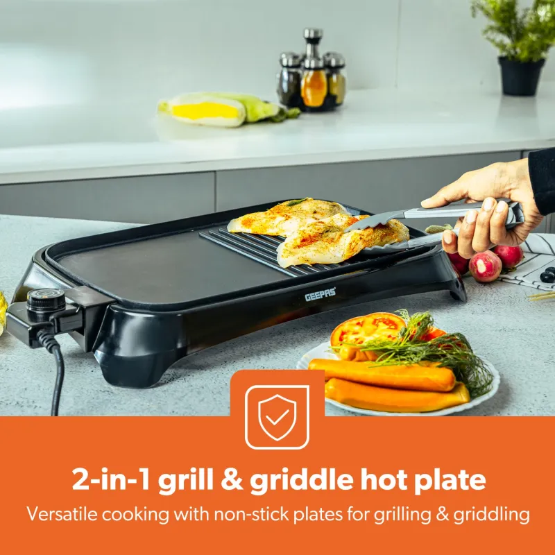 - NON-STICK GRILL PLATE & EXTRA GRIDDLE PLATE – Grill/Griddle Plates: cooking area includes a cooking area with non-stick grill plate and a non-stick griddle plate and Aluminium drip tray that collects extra fats, and juice easily.