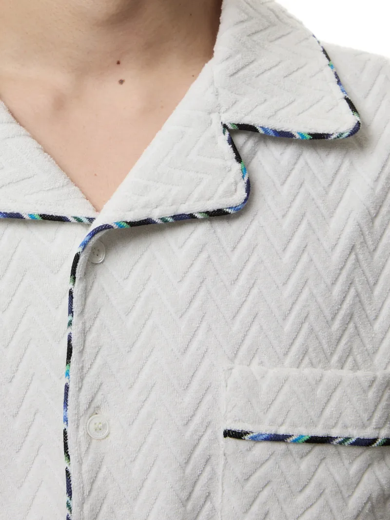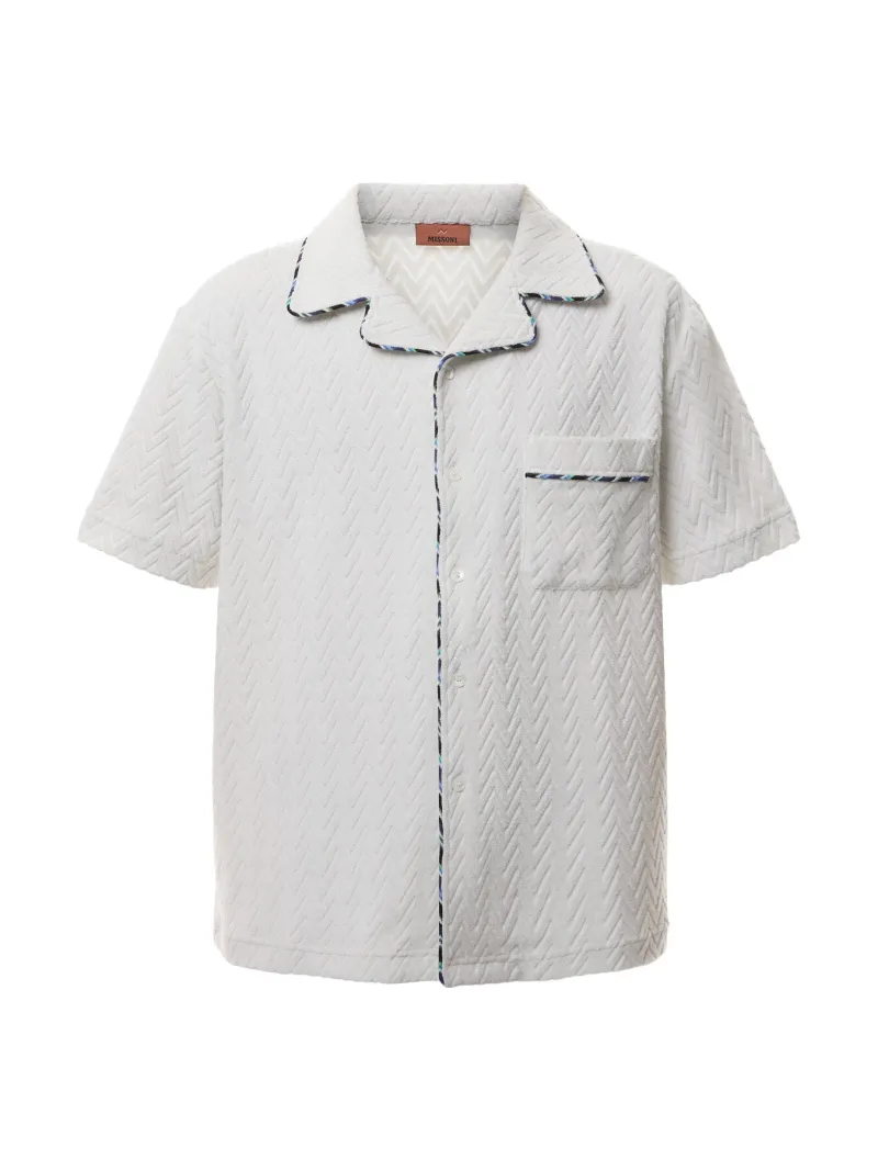 This Jacquard Terry Chevron Short Sleeve Shirt is expertly made in Tunisia to provide you with a stylish and comfortable option for your wardrobe. Its unique design is perfect for any casual or dressy occasion. Bring a touch of elegance to outfit with this quality shirt.
