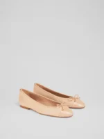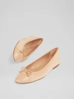 The Kara ballerina pumps are crafted in Spain from almond-hued beige suede. They have a round toe with patent leather toe cap and bow detail, and a sleek silhouette.
