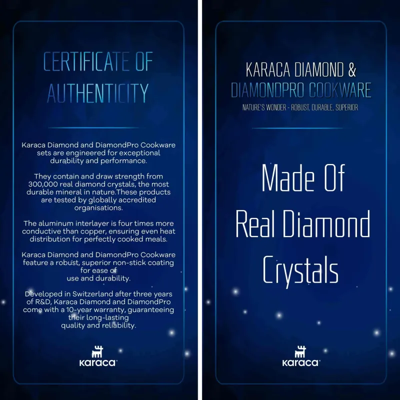 Made from the most durable minerals in nature, BioDiamond is covered with diamond crystals. Handles coated with silver nanoparticles, developed with the Antibacterial Silver Nano-Tech Handle technology, keep their antibacterial properties for many years. They are ultra-durable and resistant to scratches. Non-stick surface allow you can cook meat, fish, eggs, and vegetables healthily without using oil. The product is PFOA-Free and have 10-year warranty