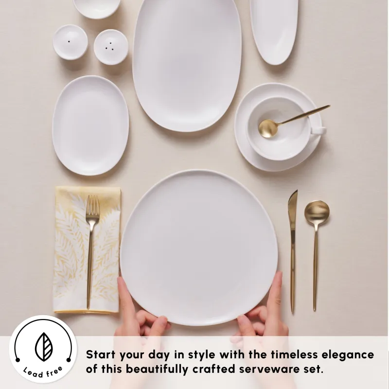 Thoughtfully designed to serve six people, this 34-piece set includes all the essentials for stylish dining. It features 6 service plates, 6 tea cups, 6 saucers, and 6 small bowls—perfect for serving a variety of dishes. Complementing these are 2 serving platters in different sizes, 1 large serving platter, and a matching salt and pepper shaker duo to complete your table presentation.