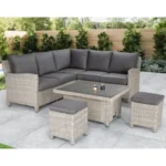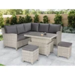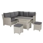 This Palma Mini Corner Sofa Set by Kettler includes a mini corner sofa, wood-effect slat topped high/low height adjustable table, and two stools.