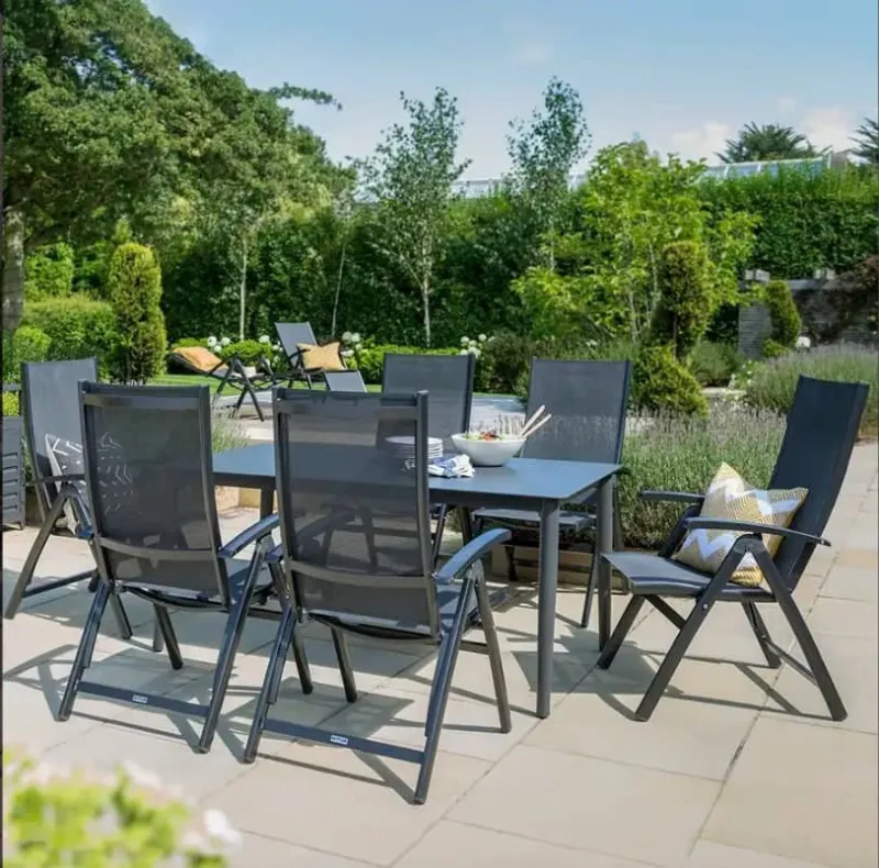 The Kettler Surf Active 6 Recliner Seat Garden Dining Set is a contemporary style garden furniture set for modern gardens and conservatories. The hard wearing and durable dining table is made with powder coated aluminium and the glass tabletop has a teak effect for added style. As it’s weatherproof and rustproof you can keep the table outdoors all year round, without it deteriorating. The Active multi-position dining chair is both functional and comfortable. With a reclining back, the dining chair will enable you to enjoy the long summer afternoons in comfort.