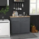 Give your home a stylish way to hide your trash can with the tilt-out trash cabinet! This trash cabinet has a solid rubber wood tabletop with ample room to display kitchen appliances and prep your food. It features a tilt-out door that elegantly accommodates waste bins of 70L. This single trash can cabinet is also designed to store your dirty clothes and organize your pet supplies. The enclosed cabinet has a 3-position adjustable shelf with capacious storage to hide your clutter. The 2 drawers also provide organizing spots for silverware and utensils. This kitchen island with trash can holder has a strong structure that lasts for quite a long time to provide you with great service. If you are looking for such a product, don’t hesitate to place an order! Convenient Trash Cabinet: This trash bin sideboard, designed with a unique tilt out door for storing your trash can up to 70L, can effectively hide the unpleasant smell and prevent your pet from knocking over the trash can. Besides, putting the laundry basket into the trash cabinet is also a good choice. Ample Storage Space: There are 2 drawers for you to put utensils within reach and the wide countertop is able to hold cooking machines and prepare food. Moreover, the right cabinet of this kitchen side cupboard has a 3-position adjustable shelf for flexible storage. Solid Structure: The floor cabinet organizer is made of strong MDF material with eco-friendly paint which ensures high bearing capacity and long life service. In addition, the premium hinges hold the board tightly that you can use the kitchen storage cabinet for years. Wide Application: The unique colour matching and the silver metal handles reflect the modern style and elegance of the tilt-out laundry cabinet. So the design of the recycling cabinet can blend into all your house decor such as the kitchen, living room, dining room and more. Easy Assembly and Maintenance: With detailed instruction and complete accessories you can set the kitchen furniture in a short time. Moreover, the surface of the storage buffet cupboard is smooth and waterproof which is easy for you to wipe with a clean cloth.