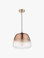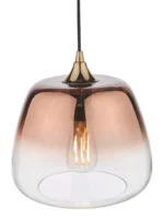 The Klaxon single pendant features a modern glass shade finished in a rich copper ombre fading to clear. The ombre glass is a bit of a favourite of ours, it allows a lot of light out but also helps stop the glare associated with clear glass. Fitted with 1m of black fabric covered cable which is adjustable on installation.
