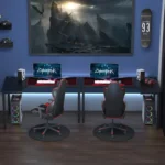 Attention to detail wins games, and trust that this ergonomic gaming desk is built to win. ‘L’ shape design gives more working space than your average table – room for two screens/monitors, keyboard, work/gaming essentials, whilst giving you plenty of freedom to work and play. The frame is made for metal for a solid base, supporting up to 50 kg. Durable particle board table-top is covered in a textured finish for a standout look. Completed with two cable holes at the back.