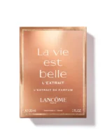 La vie est belle L’Extrait, an Extrait de Parfum composed of a voluptuous floral heart (Damascena Rose Petal, Iris Pallida Butter, Jasmine Notes, Orange Blossom Notes) heightened by an Oud Wood accord that brings signature, strength and olfactory richness.