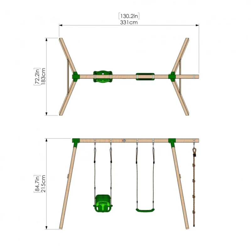 This double swing set comes complete with a 3 in 1 baby seat, single swing seat and a climbing rope . The 3 in 1 baby seat can be adjusted to grow with your child in the 3 stages of their growth, the height of the single swing seat and the 3 in 1 baby seat can be adjusted.