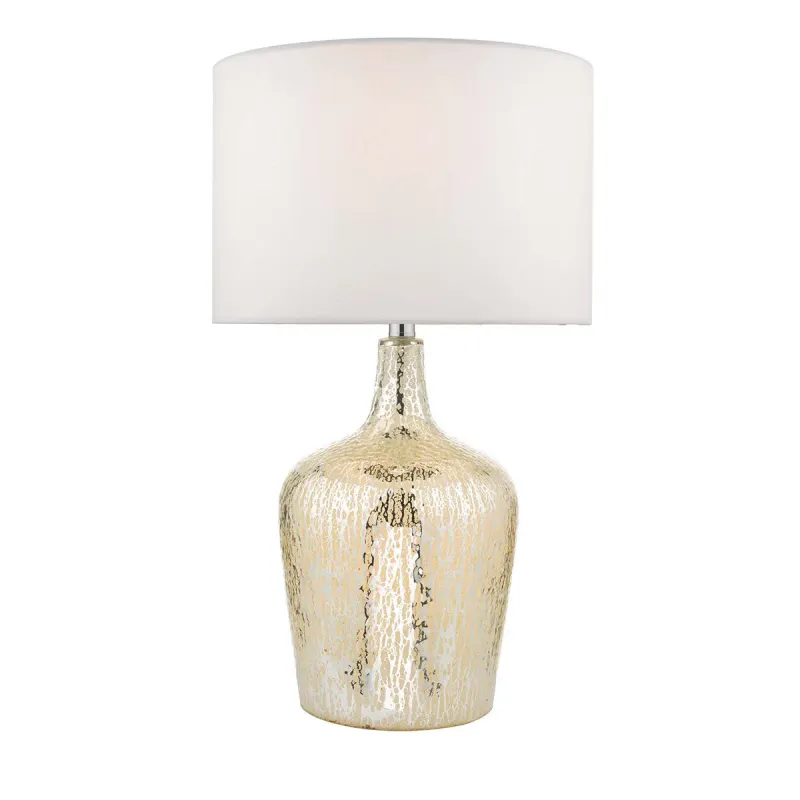 The dual light Lolek table lamp features a textured, silver glass base. When lit, the base creates a wonderful soft glow whilst the shade generates a beautiful diffused light. Complete with an ivory faux silk drum shade.