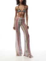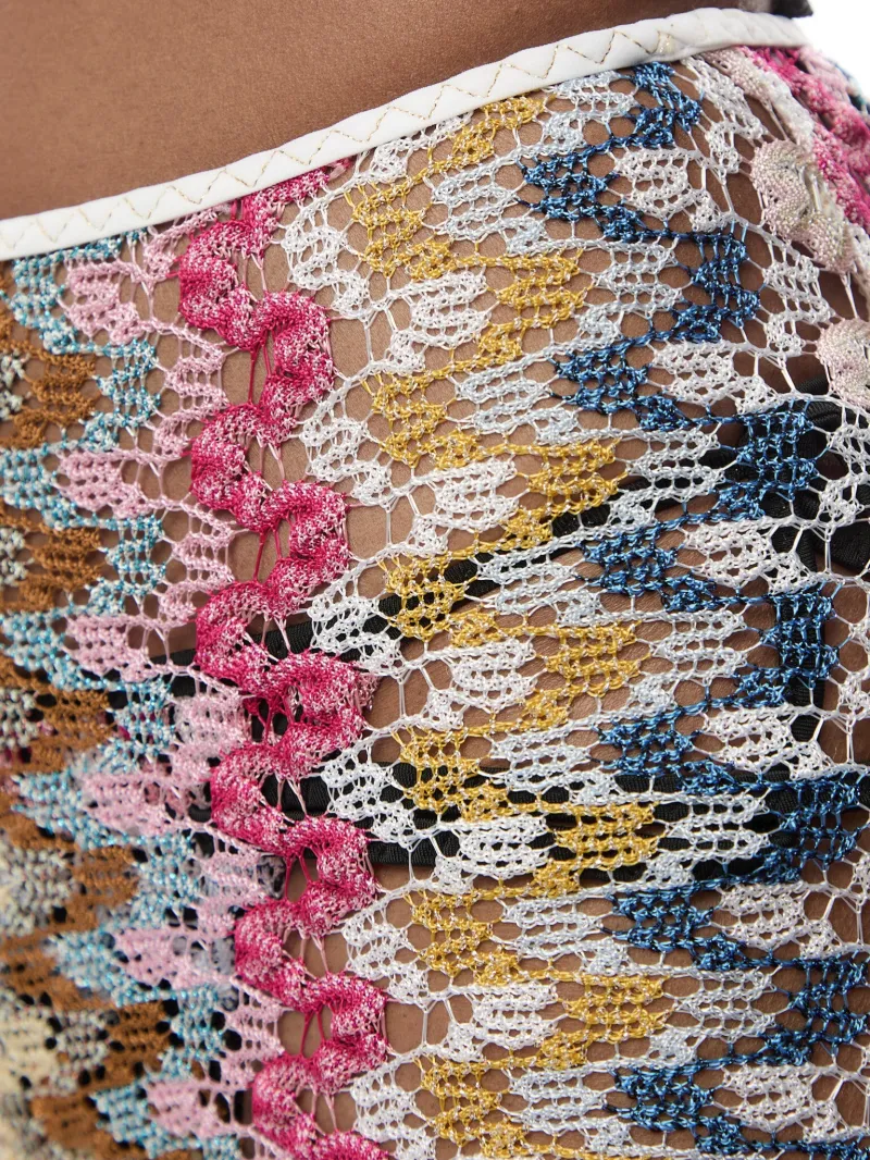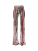 Shimmering reflections of lamé characterize these flared viscose lace trousers by Missoni. The elegant style combines the delicacy of lace with the luminous effect of lamé, offering a sophisticated interpretation of the brand’s DNA. The low-rise design that ends with a flared hem gives the garment a slender silhouette.