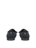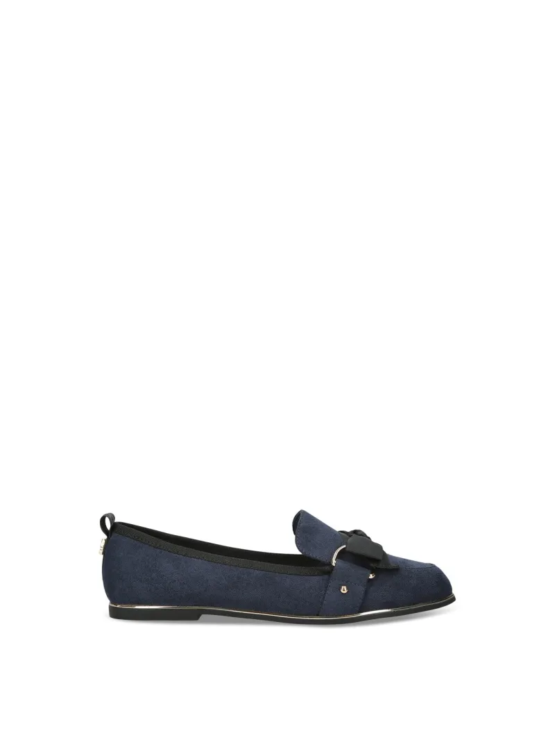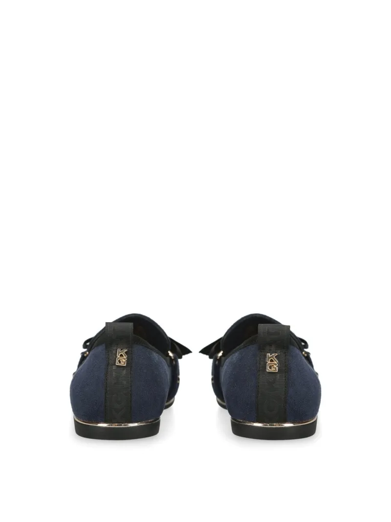 The KG Kurt Geiger Mable3 ballet flats feature a navy suedette upper with fabric bow sat on the front. There is a gold detail surrounding the sole. This product has undergone 167 checks to be registered with The Vegan Society