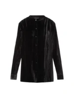 The Mandarin Collar Long Shirt is a sophisticated and comfortable garment with a long band collar, showcasing shirring at the back and 6-inch side slits. Made from a soft and luxurious washable velvet blend with a hint of silk, it offers a refined silhouette that narrows at the shoulders and widens at the hem, providing a comfortable fit.
