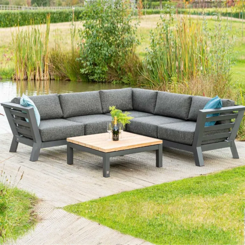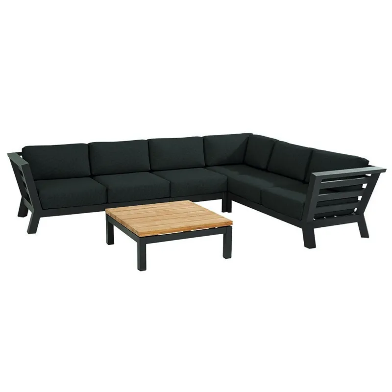 Welcome to ultimate relaxation with the Meteoro Modula Lounge Corner by 4 Seasons Outdoor. Featuring a durable aluminium frame and weatherproof cushions, this Modula corner sofa is perfect for lounging in nice weather. The high quality teak table adds a touch of elegance to your outdoor space. Enjoy peace of mind with a 5 year warranty.