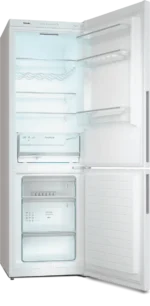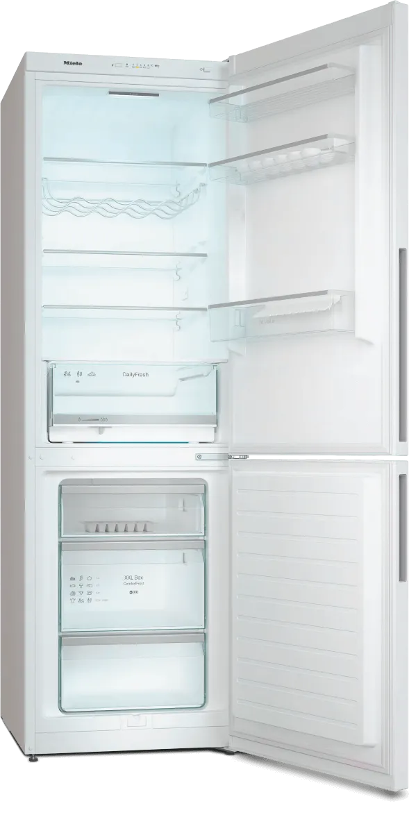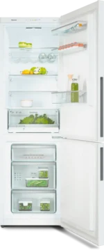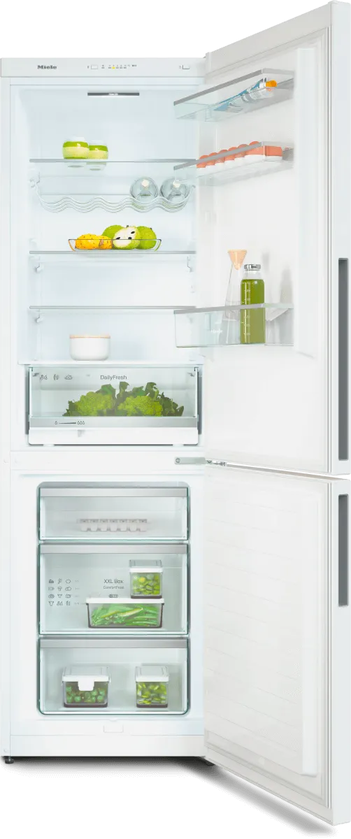The Miele KD4172E is a 60/40 freestanding fridge freezer offering 308 litres of storage. Features include DailyFresh humidity-controlled drawers for longer-lasting produce, DuplexCool separate cooling circuits to prevent odour transfer, and ComfortFrost technology to reduce defrosting frequency.