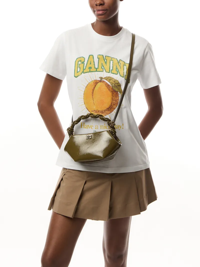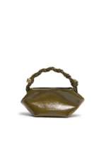 This Olive Green Mini GANNI Bou Bag features a tone-on-tone metallic GANNI Butterfly logo, a twisted handle with a braided knot, and a gold-tone metallic dice with a GANNI Butterfly logo engraved. The bag has an internal magnetic closure, a flat card pocket inside, and an adjustable and removable shoulder strap for crossbody wear.
