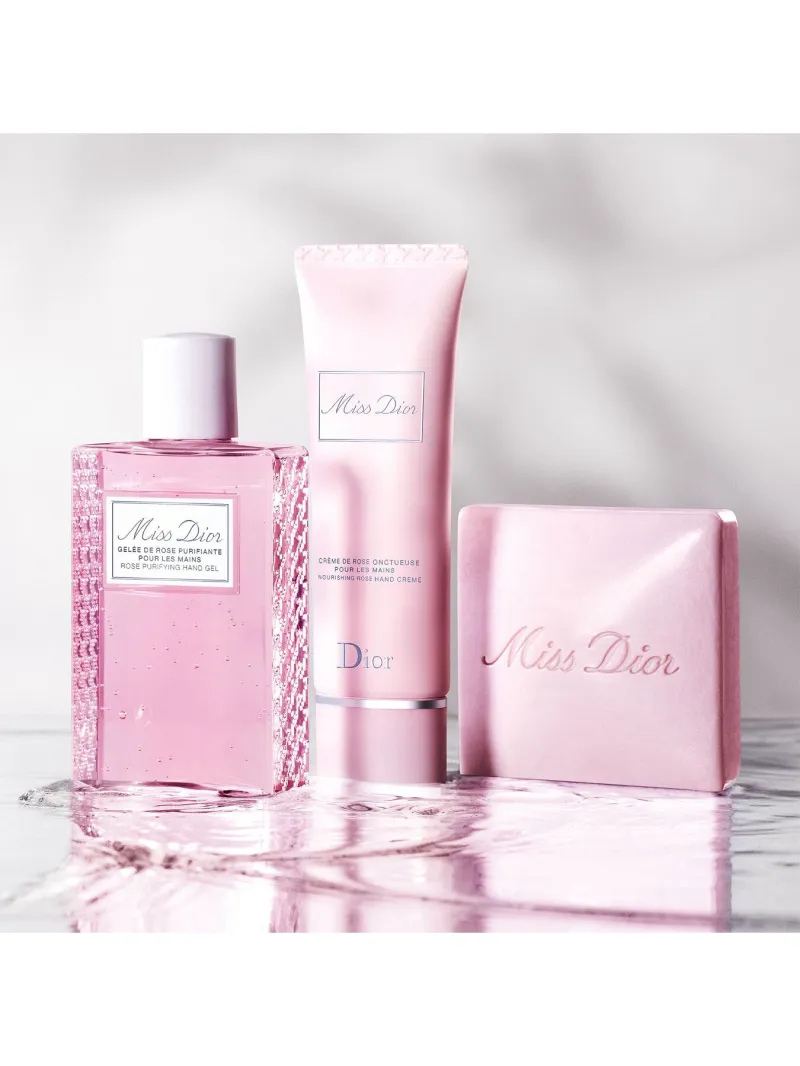 Dior has created the Miss Dior rose purifying hand gel, a delicately scented hand gel. Use this rose purifying gel at any time of day to clean, moisturise and perfume your hands without soap or water. Its formula, infused with Rose Centifolia water, keeps skin moisturised while gently cleansing the hands.