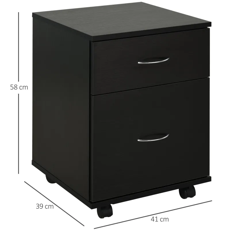 Keep your important paperwork and office supplies well organized with this HOMCOM rolling storage organizer. This rolling cart with 2 drawers offers ample storage space for your different items. There are 4 omnidirectional wheels, 2 have brakes for easy movement. Made of durable particle board, the mobile filing cabinet will not break or crack easily. The minimalist style goes well with contemporary or modern home and office decor. Just buy our file cabinet to fill your home and office space!