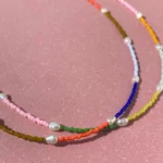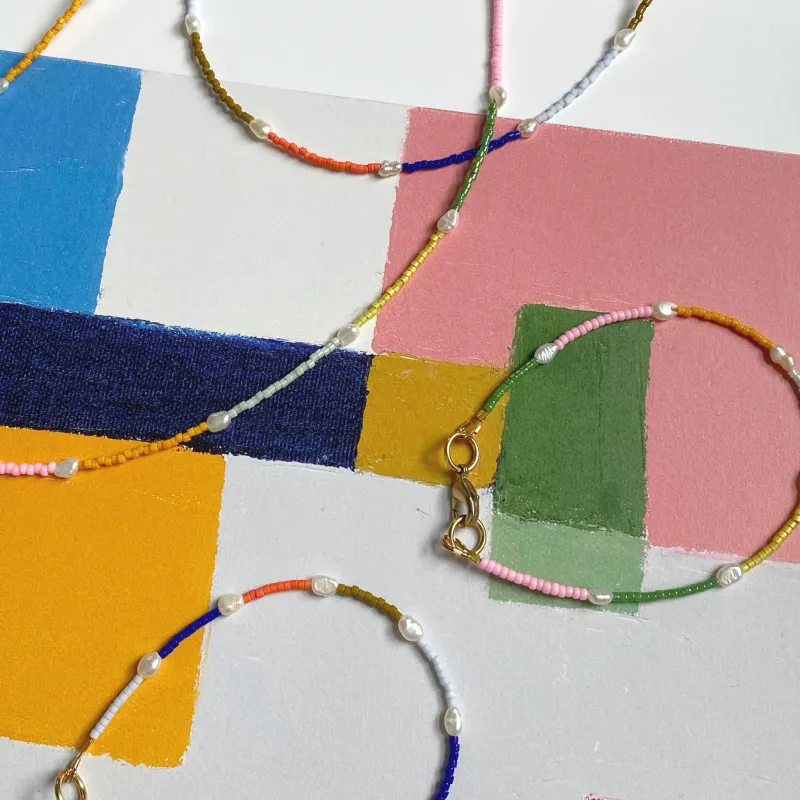A bright choker length necklace, perfect for summer. Handmade in the Loela studio in small quantities. Bright vivid glass beads with freshwater pearl accents.