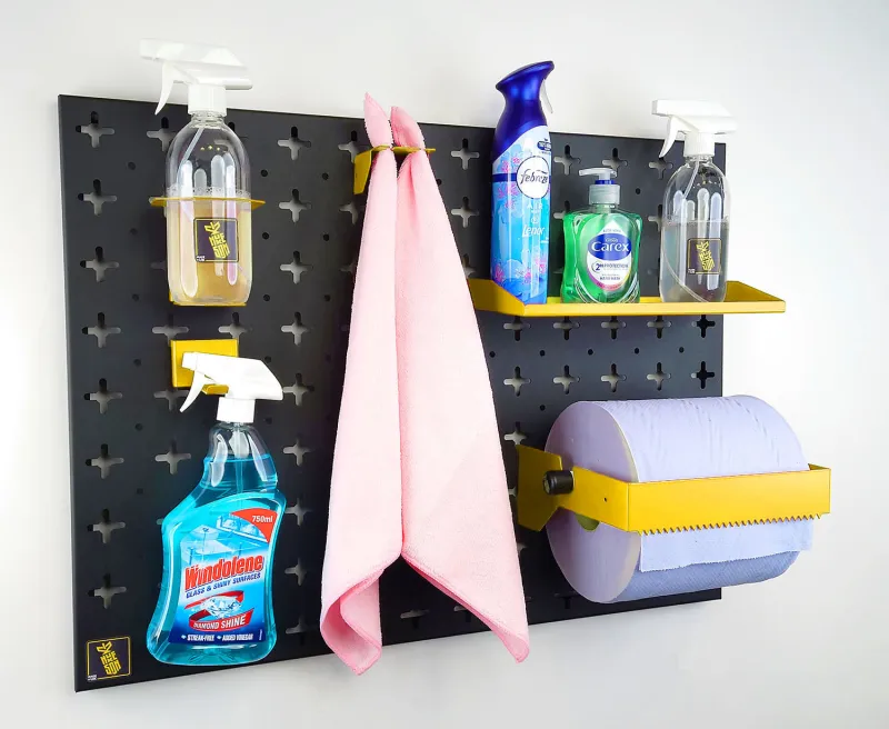 This starter kit will introduce you to the amazing collection of Nukeson Tool Wall Products. This Tool Wall Organiser kit features items related to Cleaning & Janitorial Supplies, suitable for placing in areas where cleanliness must be upheld or where you want to make your cleaning schedule more efficient. Included within the kit are a Blue Roll Holder, a Hook for cleaning cloths and hooks, shelves and brackets for storing additional cleaning supplies.