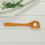 This risotto spoon has a hole in the centre which increases the surface area of the spoon. By allowing grains to pass through, the risotto can be stirred faster to create the smoothest texture towards the end of cooking. Olive wood has a high oil content which makes it extra-resistant to bacteria – ideal for cooking utensils.
