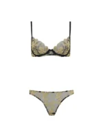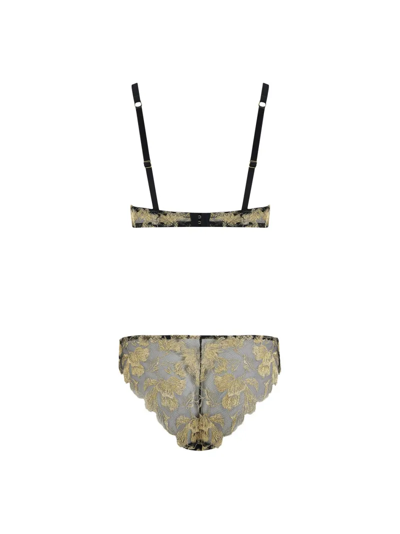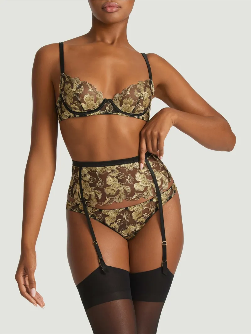 Feminine designs that instantly boost your confidence are part of Coco de Mer’s DNA – look no further than the Oriana plunge bra for proof. Delicate mesh works as the perfect canvas for intricate gold-tone embroidery – which depicts flower petals – as scalloped edges further enhance the romantic nature of the piece.