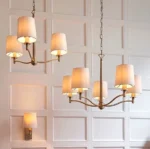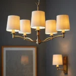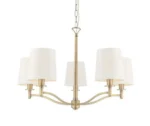 This 5 light pendant is finished in a matt antique brass effect plate with vintage white faux silk shades. This fitting has an adjustable drop, is dimmable and suitable for use with LED lamps. Matching items available.