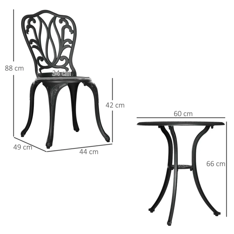 Add a touch of elegance to your outdoor areas with this Outsunny set. Includes two chairs and a matching table. Centre umbrella hole to hold a parasol in place. Garden table and chairs are made from aluminium for strength, with the decorative patterns for a decorative finish.
