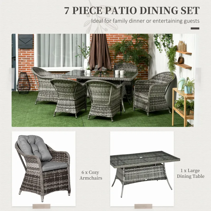 Outsunny 6 Seater Rattan Dining Set with Seat and Back Cushions, Round PE Rattan Garden Furniture Set, Outdoor Dining Table and Chairs, Rectangular Glass Top Table with Umbrella Hole, Grey