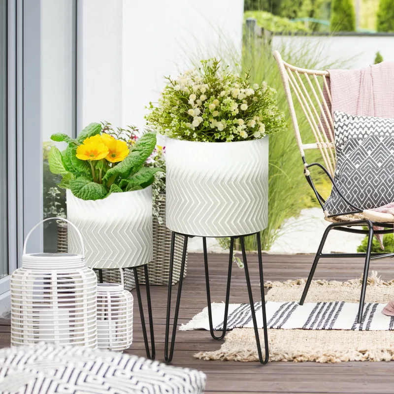use together or separately. Made from metal, the planter with stand are both strong, made into a pattern design for a cool look. Complete with three hairpin-shaped legs for a unique finish. Please note: no drainage holes.• Two sizes: small and large