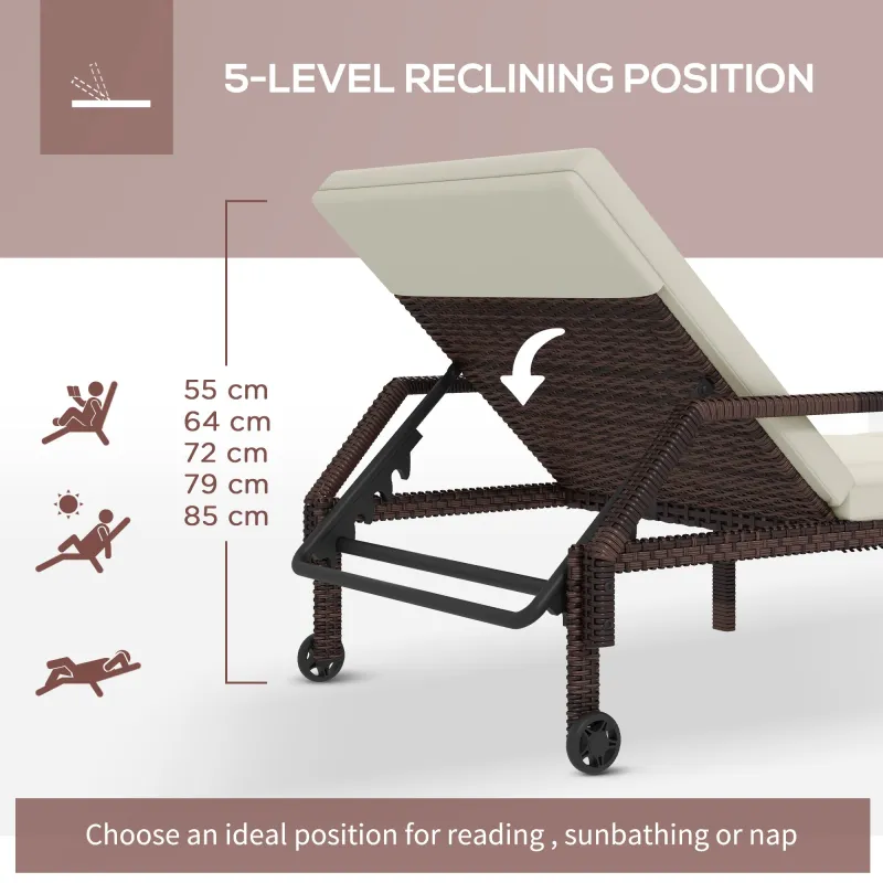 Outsunny Outdoor PE Rattan Sun Lounger Set of 2, Wicker Chaise Recliner Garden Chair with 5-Level Adjustable Backrest and 2 Wheels, Cream White