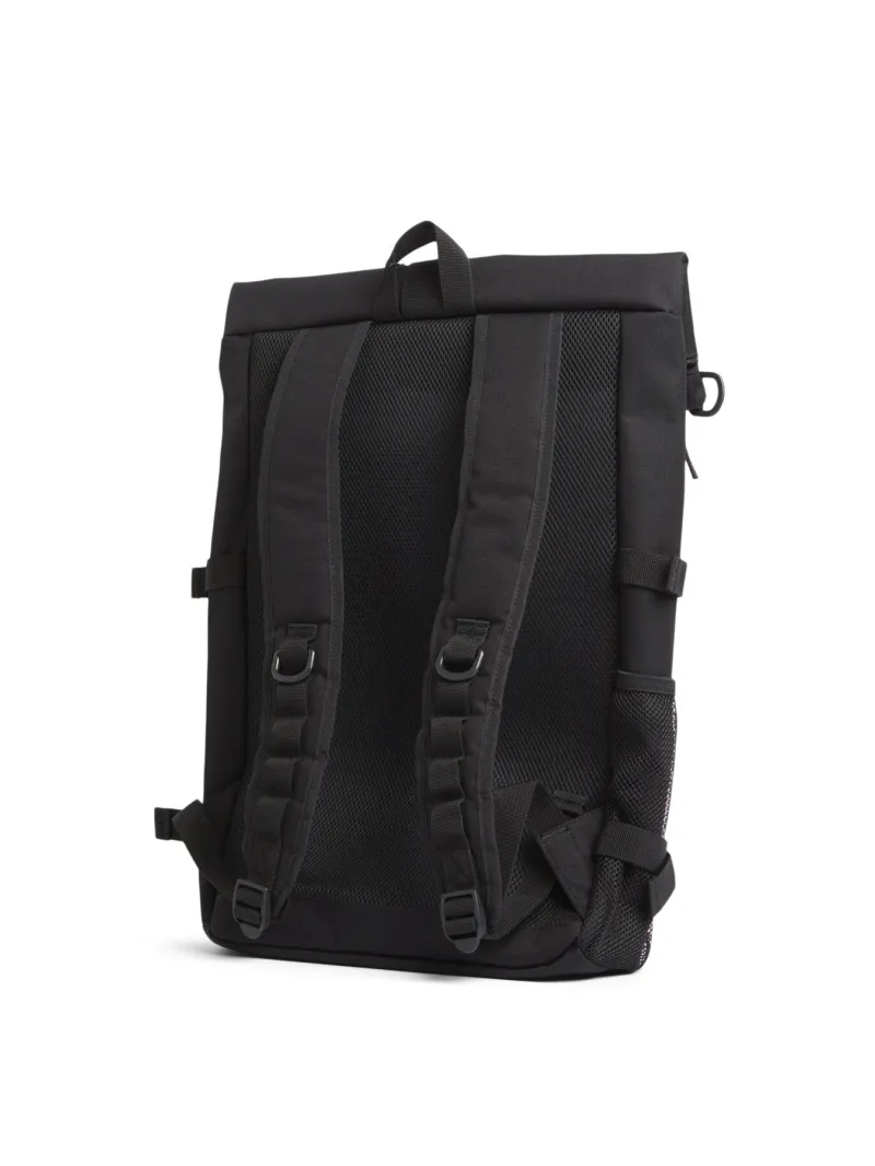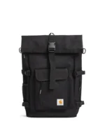 The Philis Backpack is an expandable style constructed from water-repellent, recycled polyester canvas. It features an unlined main compartment with a zip and flap closure, a padded inside pocket, and adjustable shoulder straps.