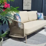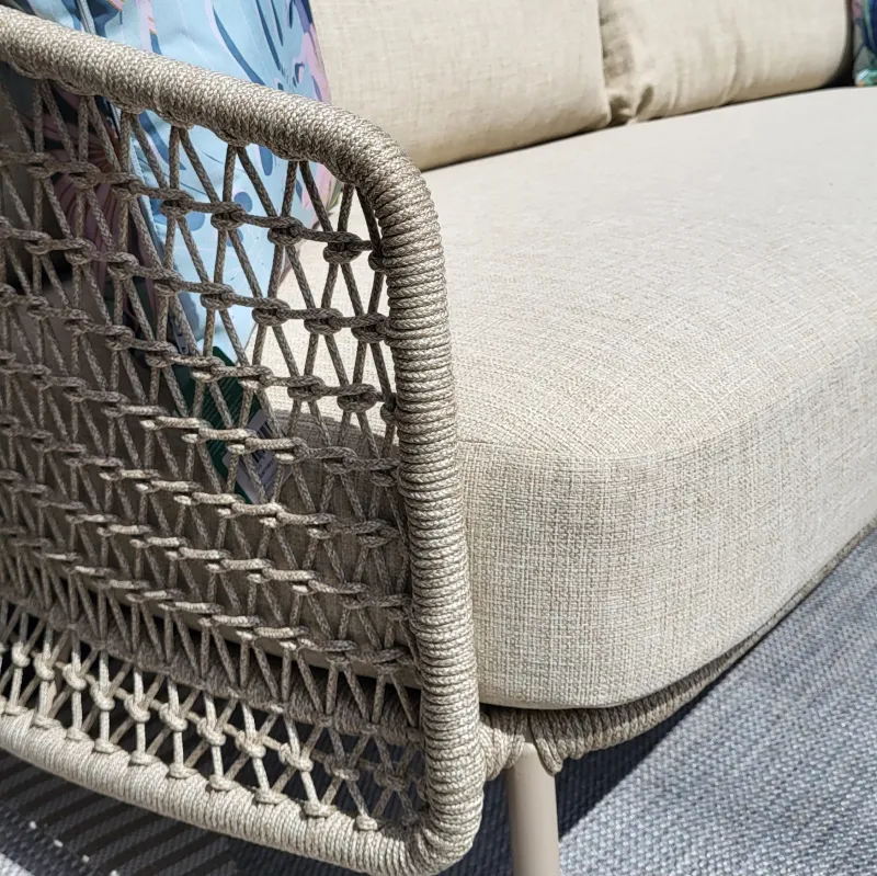 Elevate your outdoor space with the contemporary Puccini Outdoor Lounge Sofa. This all-weather sofa features a durable aluminium frame and stylish rope detailing. Now available in a new chic latte colour.