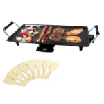 Perfect for cooking up a large healthy grilled meal or traditional mixed grill. The generous 47 x 26.5cm non stick cooking area allows a hearty meal to be cooked up to personal taste. Cook meat, veg, eggs and just about anything else! The flat surface is perfect for meats and vegetables as it browns food on the outside whilst keeping it moist on the inside. Ideal for hosting parties or cooking individual meals, the electric flat plate is suitable for barbecue style cooking, cook a hearty breakfast or create delicious nutritious meals with minimal fuss. The set includes 8 wooden spatulas and a drip tray. The non slip feet ensure the grill is kept secure on a table or work top, while the temperature control allows you to cook your food to perfection. A great addition to the kitchen and the table. Great for parties and you can even take it caravanning or camping with you. Easy to clean due to non-stick plates and oil drip tray. Cool touch handles are fitted for your safety. Approximate dimensions: 63.5 x 28.5 x 11cm