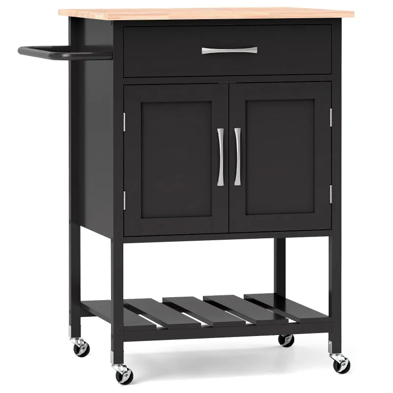 Organize your kitchen essentials with ease, thanks to the ample storage provided by this rolling island cart. The rubber wood countertop is ideal for meal preparation or as an extra cooking station. The kitchen island cart features a handy drawer for dinnerware, a storage cabinet for kitchenware, a bottom tray for storing dishes and seasonings, and a metal bar for hanging towel. Moreover, this utility cart is equipped with 4 flexible casters (2 lockable), allowing you to move it effortlessly between your kitchen, dining room, or living room. Not only a storage cart, but also can be used as a bar serving cart or food cart, this utility cart is an ideal storage organizer for your home. Perfect Kitchen Solution: The top surface is crafted from high-quality rubber wood, offering a sturdy and expansive workspace for food preparation or serving drinks. Below the countertop, a pull-out drawer offers convenient storage for utensils. Ease Organization: This mobile serving cart features a 2-door storage cabinet that provides ample storage space for kitchen supplies. The bottom tray offers additional space for storing dishes while the handy towel rack offers quick access for mess-free cooking. Easy Mobility and Higher Stability: Equipped with 4 360°smooth rolling casters (2 with brakes), the kitchen island cart allows for effortless mobility. Moreover, you can lock the casters to keep the cart securely in place. Sturdy and Stable Structure: Thanks to thickened board, the 2-door kitchen cart presents better sturdiness and longer service life. Besides, the robust structure boasts a strong weight capacity up to 75 kg. Not Just an Island Cart: The simple and modern design seamlessly blends with interior decoration. This versatile utility cart promotes organization and efficiency in various spaces, such as kitchen, dining room and living room.