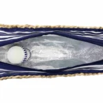 The Sac de Plage picnic tote in Riviera blue is an elegant way to carry food and drink to the beach. The spacious raffia bag has blue and white striped lining and an insulated compartment to keep food and drink cool. Inside, you’ll find four plates, glasses, a corkscrew and a set of bamboo cutlery in a smart blue case.
