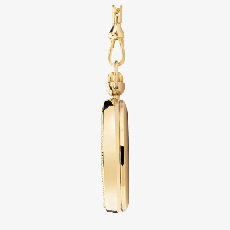 Practical and stylish, this pocket watch is perfect for everyday wear. The piece features a perforated coin edge which accentuates a matte white dial that is adorned with roman numeral hour markers. The watch is finished with a functional ionic plated brass chain and a special clasp fixture. The watch is shipped with an original box and a guarantee from the manufacturer.