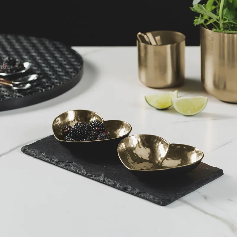 Selbrae House presents the Gold Heart Serving Dish Set with a beautiful slate board. Ideal for serving dips and treats at dinner parties, this set features a slate base and two hand-hammered bowls with a heart-shaped gold interior and black exterior, perfect for serving a variety of dips or sauces.