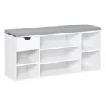 Are you looking for an entryway storage bench that can hold all your shoes? Worried that nowhere to sit to change shoes? This modern styled shoe organizer will be your ideal choice. This shoe rack has a thick padded cushion to provide you a comfortable experience. Features large capacity to accommodate 10 pairs of shoes (standard size). Besides, the middle shelves on left and right side are adjustable to store shoes of different sizes and types. So don’t hesitate and take it home now!