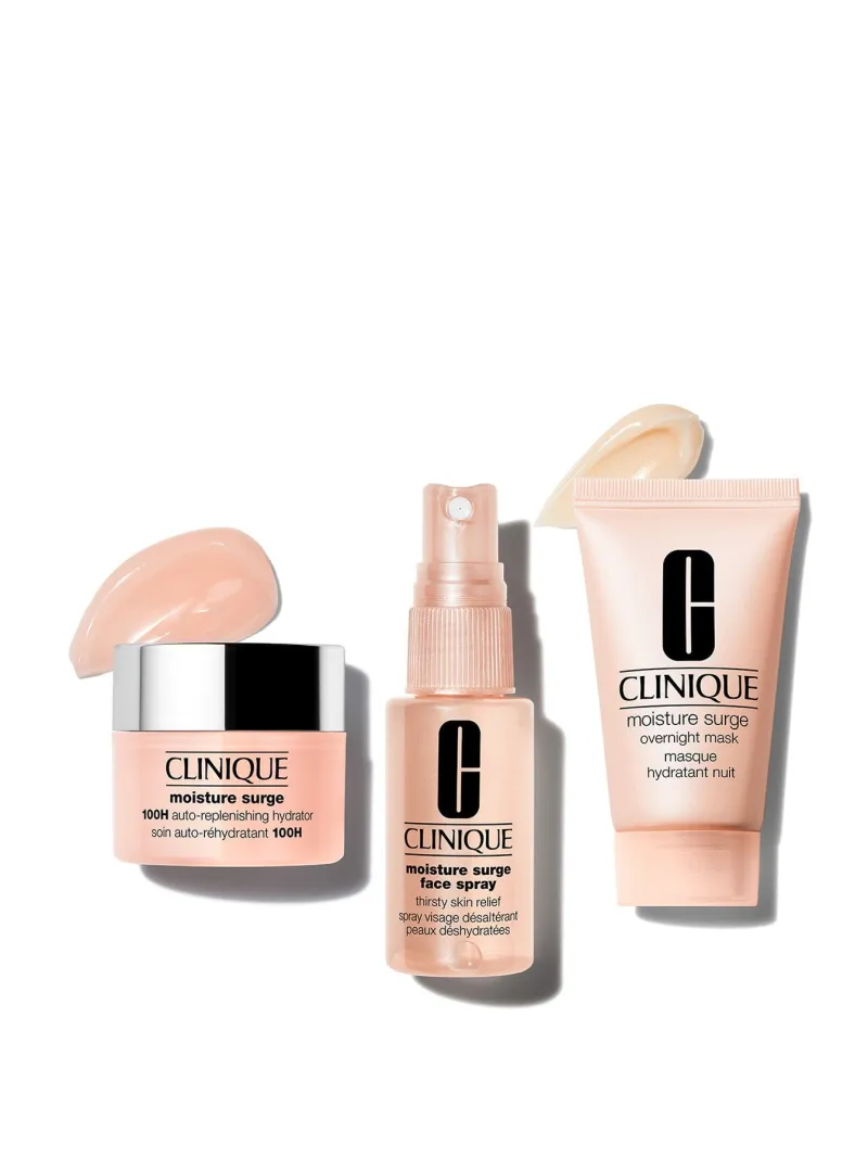 Skin School favourites for intense, all-over dewy hydration. This kit brings together favorite products from Clinique’s popular Skin School class. All Day: Moisturize. Moisture Surge 100H Auto-Replenishing Hydrator delivers a 174% immediate moisture boost and keeps skin hydrated for 100 hours, even after washing your face.